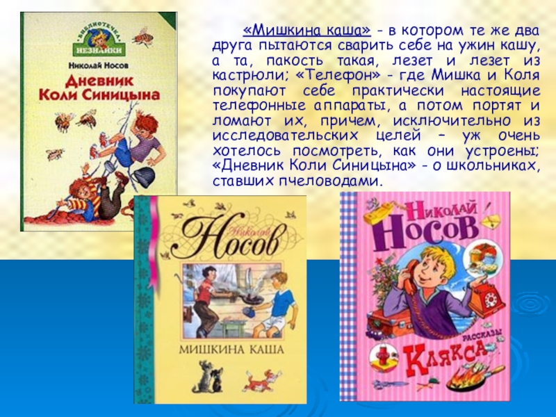 же два друга пытаются сварить себе на ужин кашу, а та, пакость такая, лезет и лезет из кастрюли; «Телефон» - где Мишка и Коля покупают себе практически настоящие телефонные аппараты, а потом портят и ломают их, причем, исключительно из исследовательских целей – уж очень хотелось посмотреть, как они устроены; «Дневник Коли Синицына» - о школьниках, ставших пчеловодами.