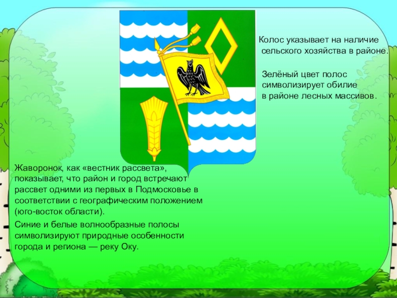 Синие и белые волнообразные полосы символизируют природные особенности города и региона — реку Оку.