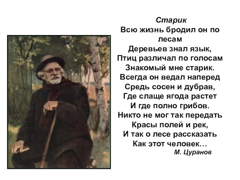 СтарикВсю жизнь бродил он по лесамДеревьев знал язык,Птиц различал по голосамЗнакомый мне старик.Всегда он ведал напередСредь
