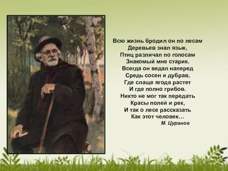 Всю жизнь бродил он по лесамДеревьев знал язык,Птиц различал по голосамЗнакомый мне старик.Всегда он ведал напередСредь