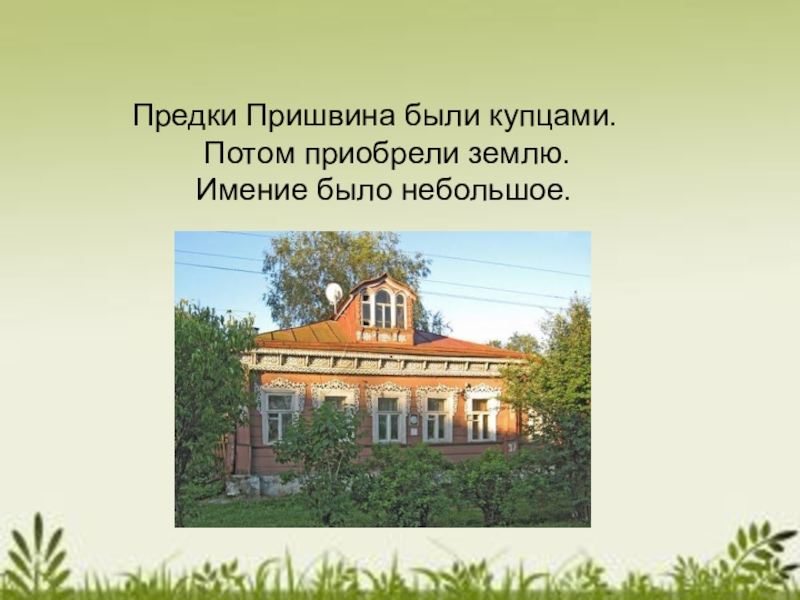 Предки Пришвина были купцами.     Потом приобрели землю.     Имение