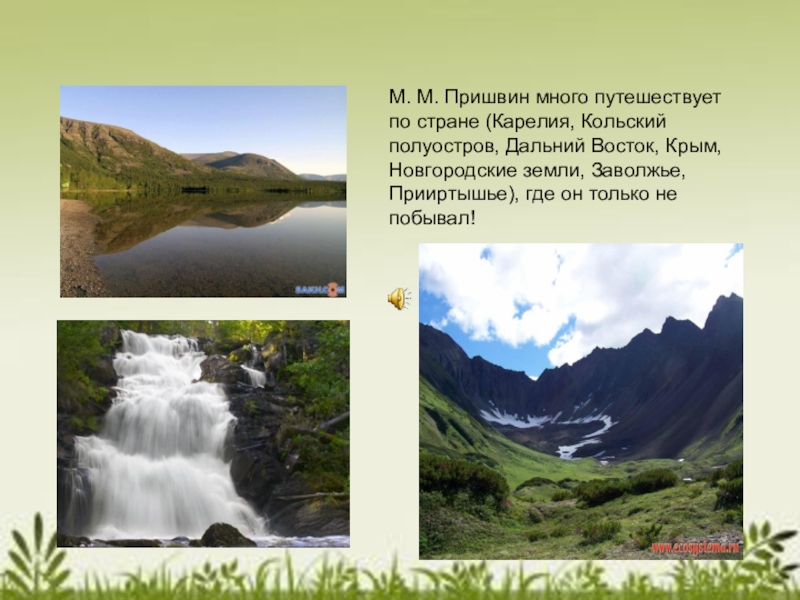 М. М. Пришвин много путешествует по стране (Карелия, Кольский полуостров, Дальний Восток, Крым, Новгородские земли, Заволжье, Прииртышье),