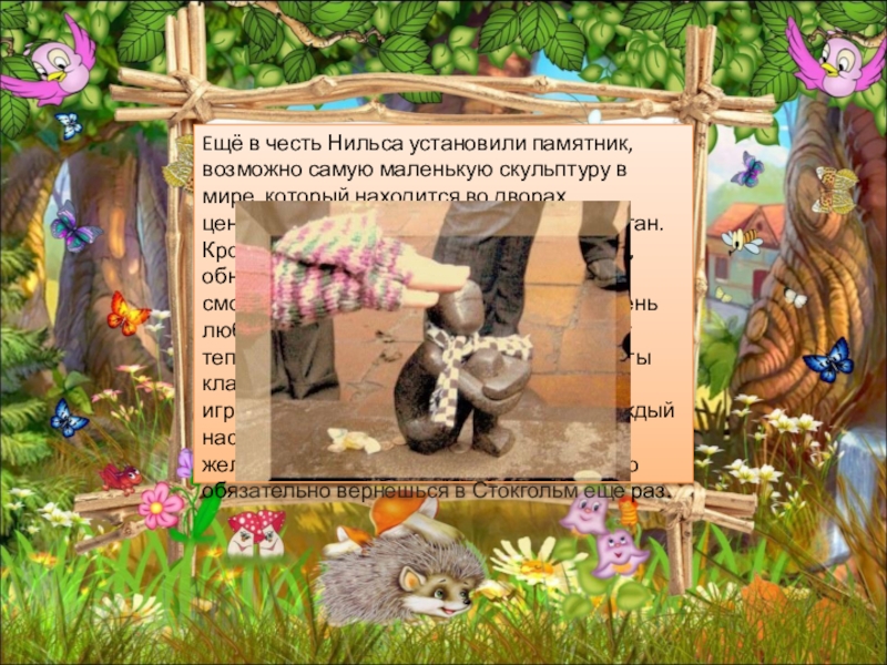 Слайд 14Eщё в честь Нильса установили памятник, возможно самую маленькую скульптуру в