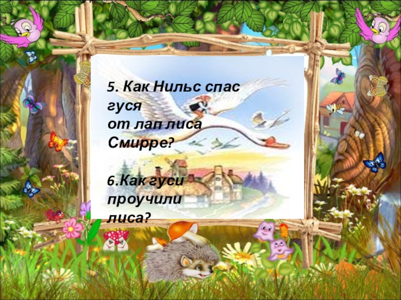 5. Как Нильс спас гусяот лап лиса Смирре?6.Как гуси проучилилиса?