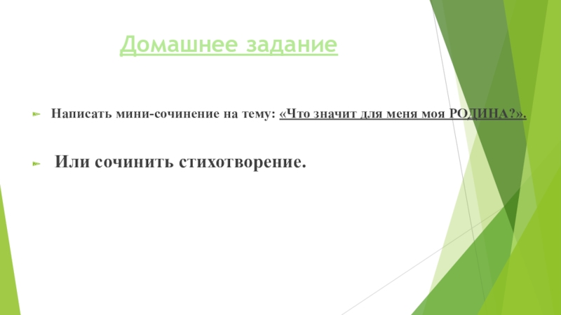 Домашнее заданиеНаписать мини-сочинение на тему: «Что значит для меня моя РОДИНА?». Или сочинить стихотворение.