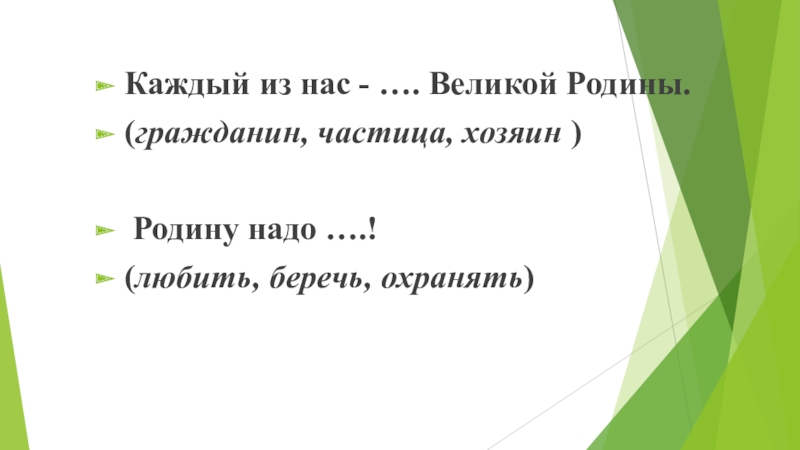 Каждый из нас - …. Великой Родины.(гражданин, частица, хозяин ) Родину надо ….!(любить, беречь, охранять)
