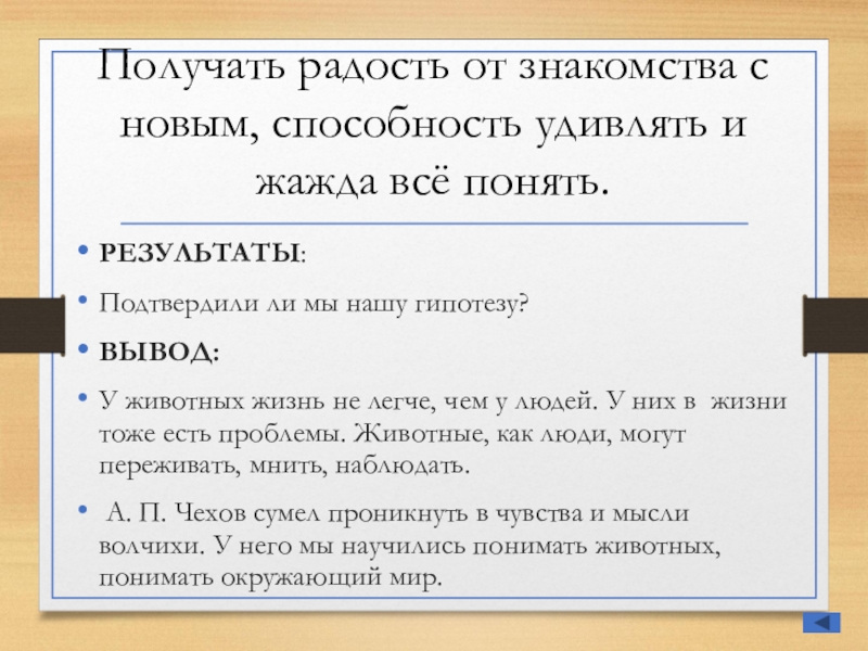 А. П. Чехов сумел проникнуть в чувства и мысли волчихи. У него мы научились понимать животных, понимать окружающий мир.