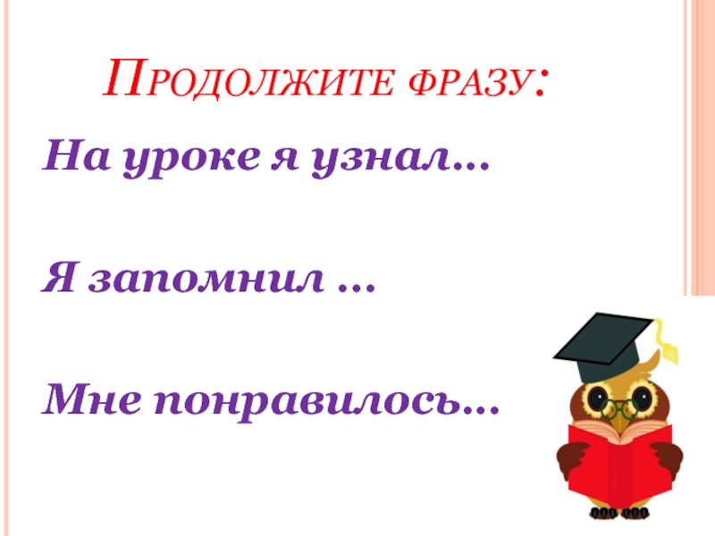 Продолжите фразу:На уроке я узнал…Я запомнил …Мне понравилось…