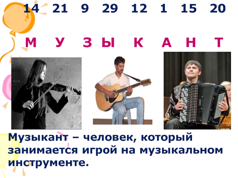 Музыкант – человек, который занимается игрой на музыкальном инструменте.