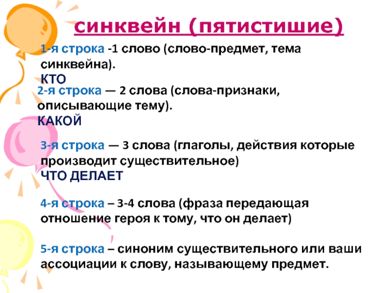 5-я строка – синоним существительного или ваши ассоциации к слову, называющему предмет.