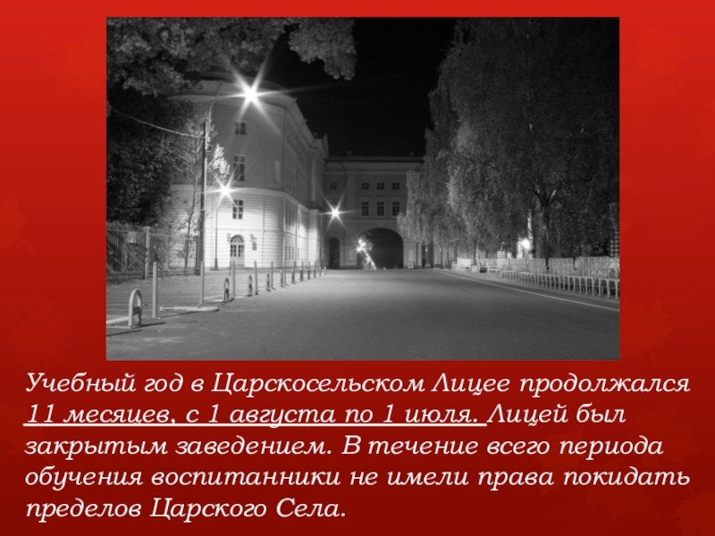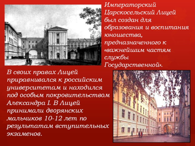 В своих правах Лицей приравнивался к российским университетам и находился под особым покровительством Александра I. В Лицей принимали дворянских мальчиков 10-12 лет по результатам вступительных экзаменов.