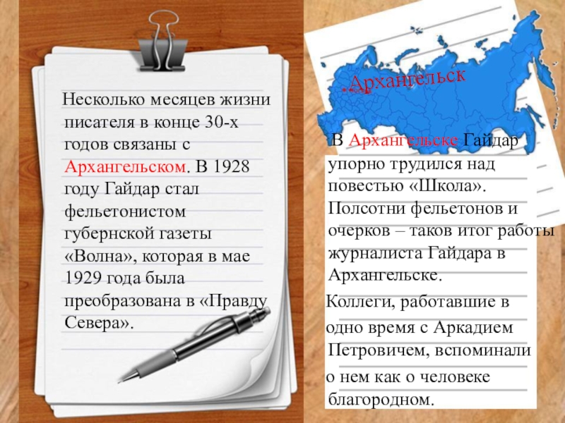с Архангельском. В 1928 году Гайдар стал фельетонистом губернской газеты «Волна», которая в мае 1929 года была преобразована в «Правду Севера».