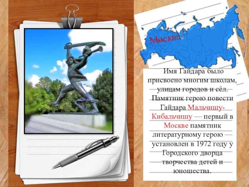 городов и сёл. Памятник герою повести Гайдара Мальчишу-Кибальчишу — первый в Москве памятник литературному герою — установлен в 1972 году у Городского дворца творчества детей и юношества.