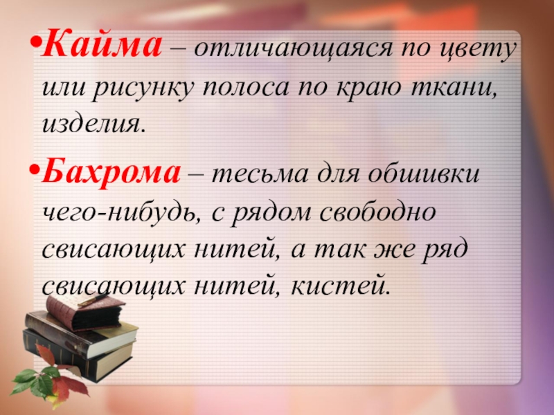 Слайд 8Кайма – отличающаяся по цвету или рисунку полоса по краю ткани,