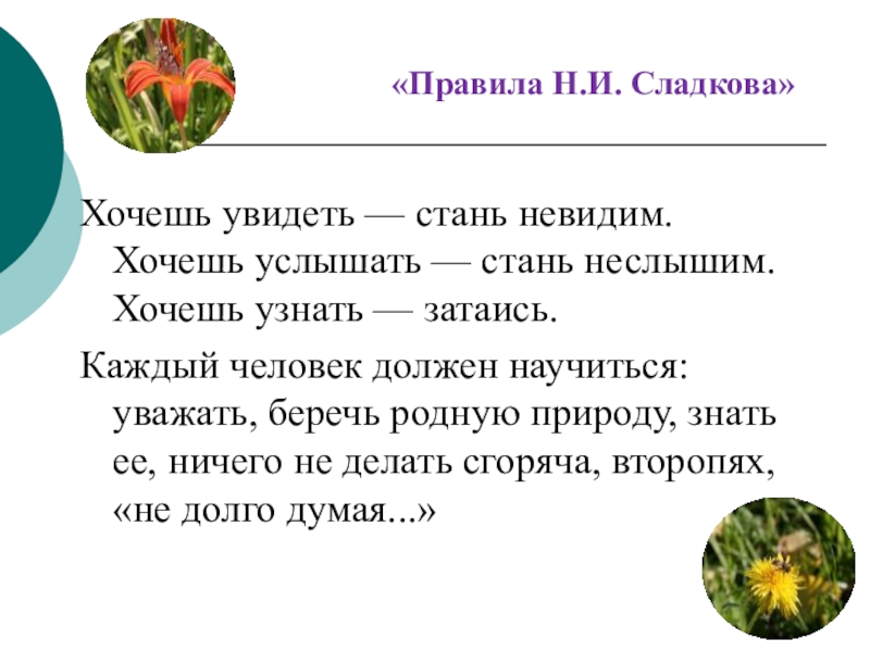 Каждый человек должен научиться: уважать, беречь родную природу, знать ее, ничего не делать сгоряча, второпях, «не долго думая...»