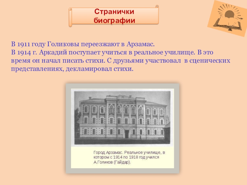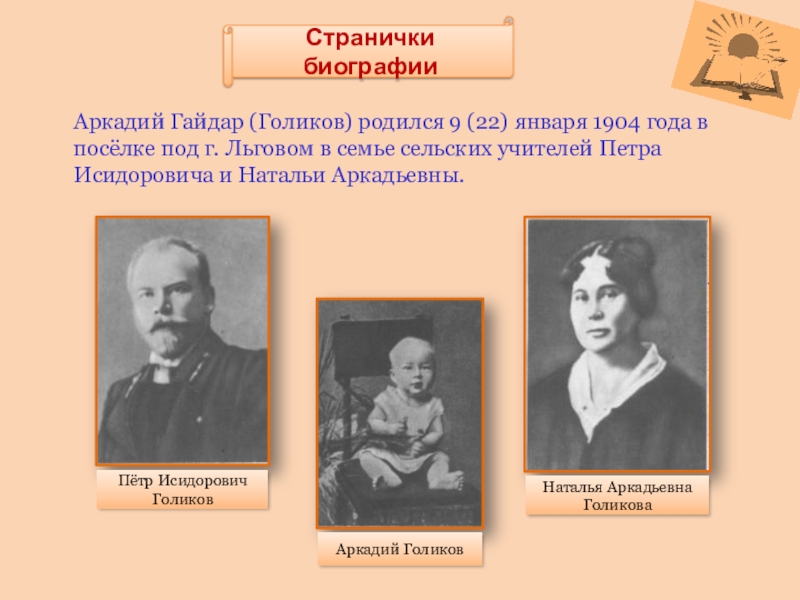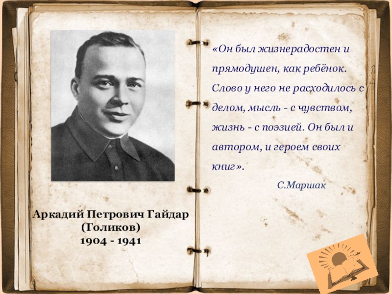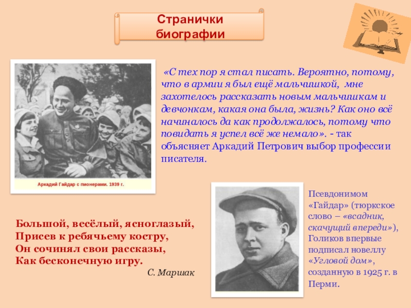 Псевдонимом «Гайдар» (тюркское слово – «всадник, скачущий впереди»), Голиков впервые подписал новеллу «Угловой дом», созданную в 1925 г. в Перми.