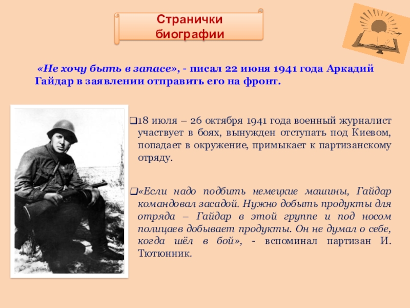 «Если надо подбить немецкие машины, Гайдар командовал засадой. Нужно добыть продукты для отряда – Гайдар в этой группе и под носом полицаев добывает продукты. Он не думал о себе, когда шёл в бой», - вспоминал партизан И.Тютюнник.