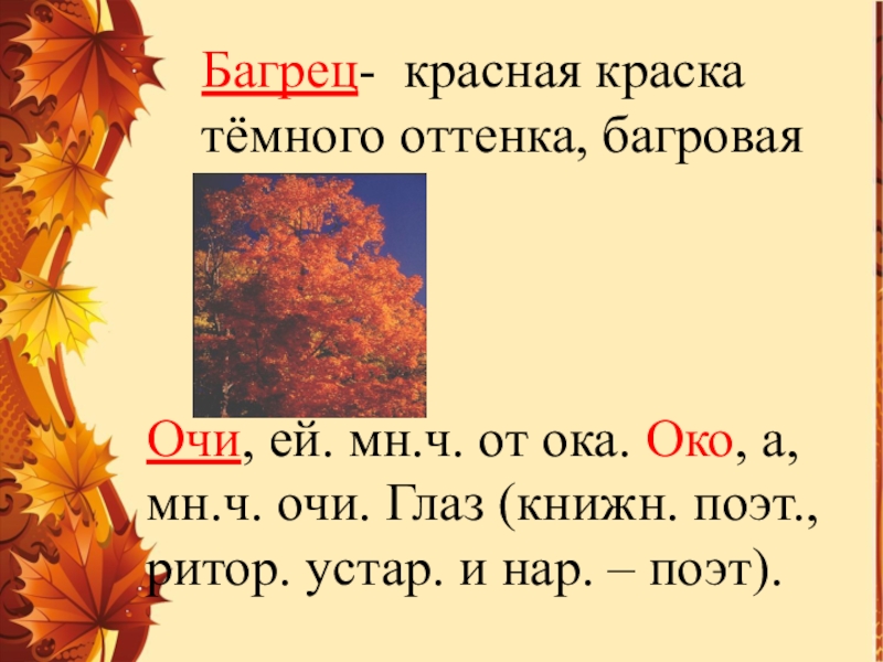 Багрец- красная краска тёмного оттенка, багроваяОчи, ей. мн.ч. от ока. Око, а, мн.ч. очи. Глаз (книжн. поэт.,