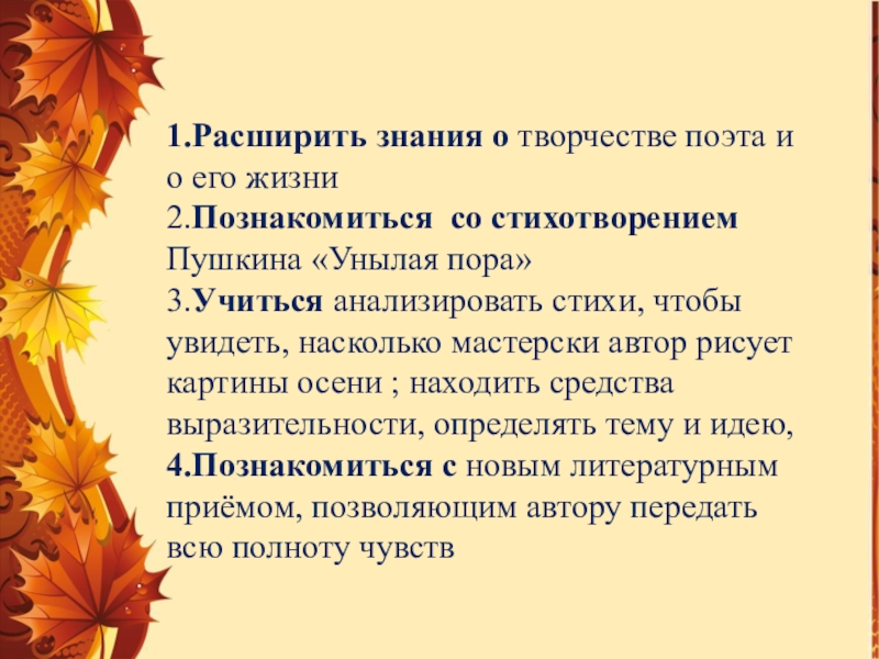 Пушкина «Унылая пора» 3.Учиться анализировать стихи, чтобы увидеть, насколько мастерски автор рисует картины осени ; находить средства выразительности, определять тему и идею,
