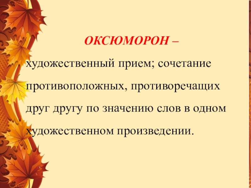 ОКСЮМОРОН – художественный прием; сочетание противоположных, противоречащих друг другу по значению слов в одном художественном произведении.