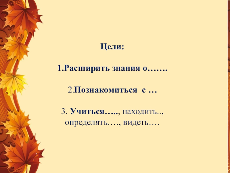 Слайд 4Цели: 1.Расширить знания о……. 2.Познакомиться с … 3. Учиться….., находить.., определять…., видеть….