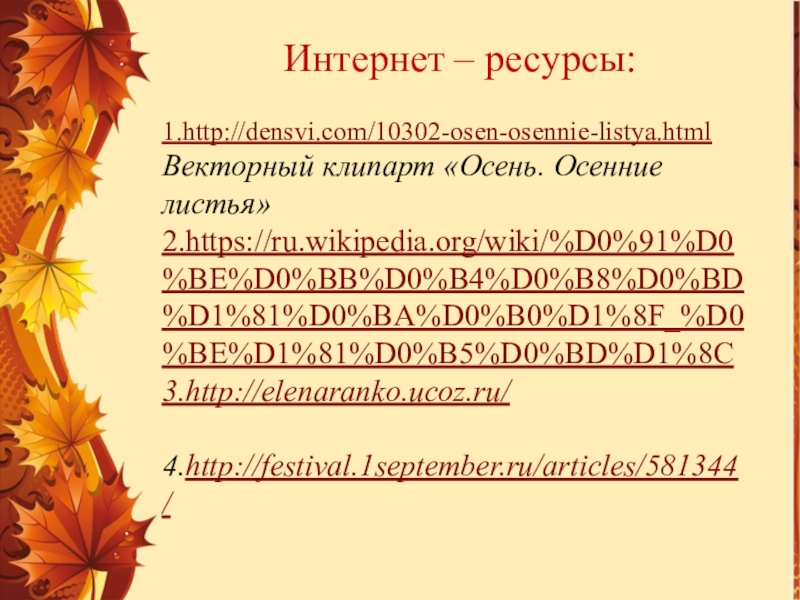 Интернет – ресурсы:1.http://densvi.com/10302-osen-osennie-listya.html  Векторный клипарт «Осень. Осенние листья»2.https://ru.wikipedia.org/wiki/%D0%91%D0%BE%D0%BB%D0%B4%D0%B8%D0%BD%D1%81%D0%BA%D0%B0%D1%8F_%D0%BE%D1%81%D0%B5%D0%BD%D1%8C3.http://elenaranko.ucoz.ru/ 4.http://festival.1september.ru/articles/581344/