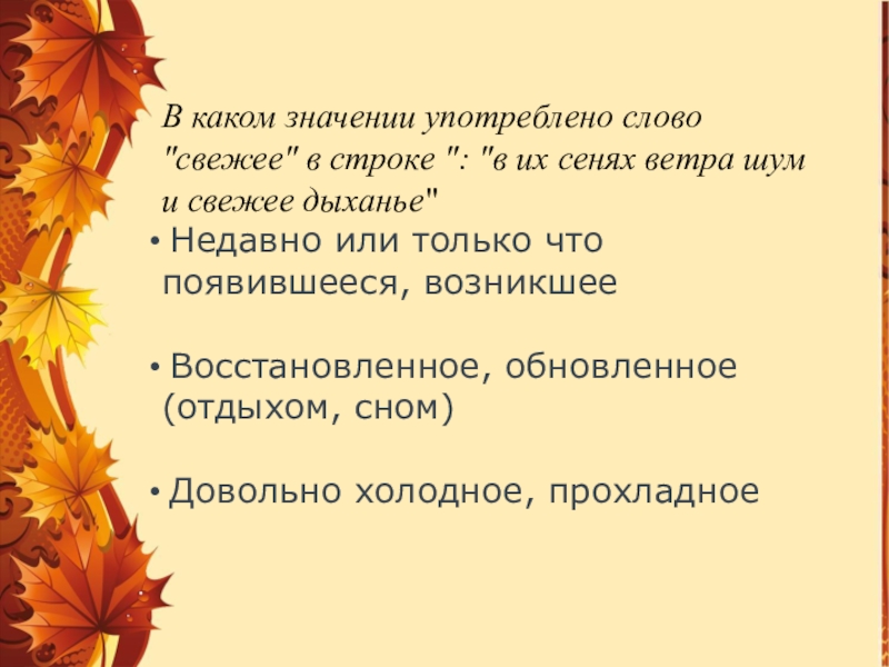 Слайд 8В каком значении употреблено слово "свежее" в строке ": "в их