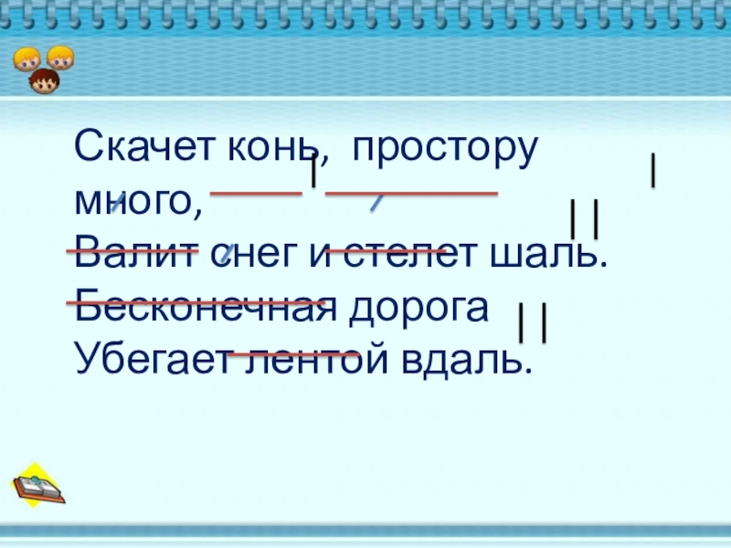 Слайд 15Скачет конь, простору много, Валит снег и стелет шаль. Бесконечная дорога Убегает лентой вдаль.
