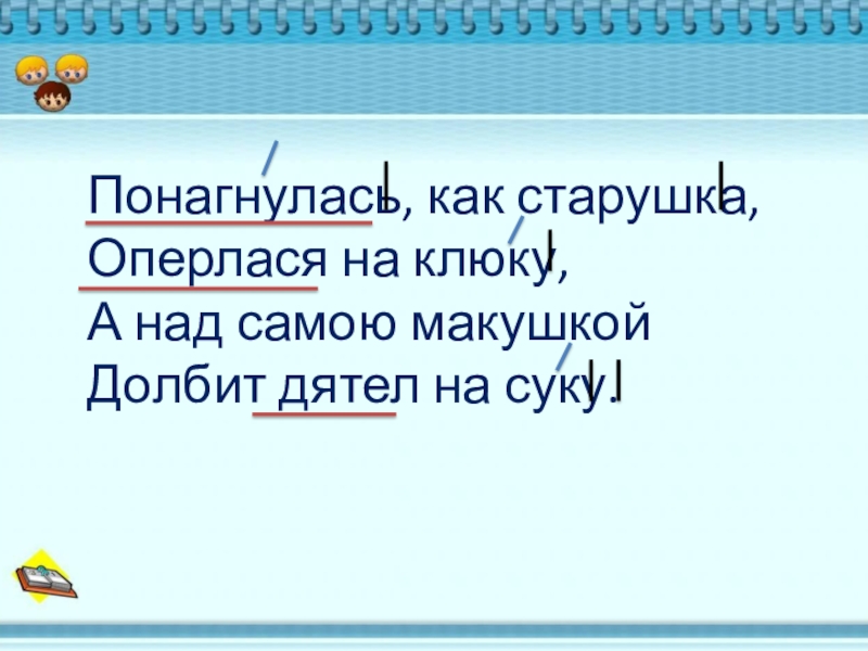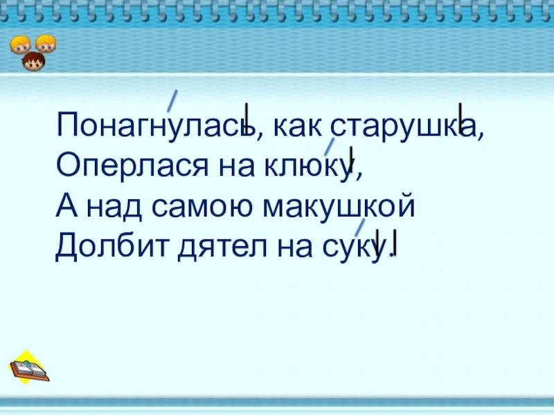 Слайд 14Понагнулась, как старушка, Оперлася на клюку, А над самою макушкой Долбит дятел на суку.