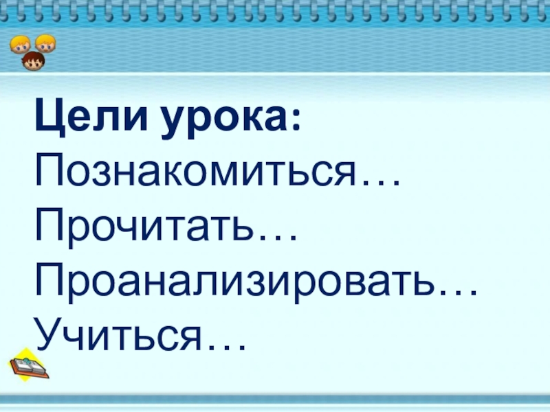 Слайд 4 Цели урока: Познакомиться… Прочитать… Проанализировать… Учиться…