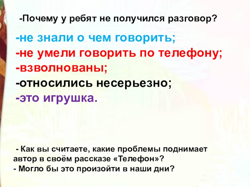 - Как вы считаете, какие проблемы поднимает автор в своём рассказе «Телефон»?