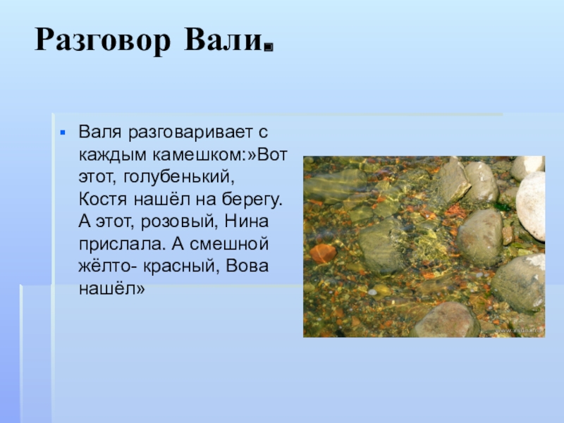 Разговор Вали.Валя разговаривает с каждым камешком:»Вот этот, голубенький, Костя нашёл на берегу. А этот, розовый, Нина прислала.