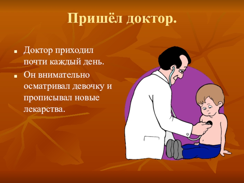 Пришёл доктор.Доктор приходил почти каждый день.Он внимательно осматривал девочку и прописывал новые лекарства.