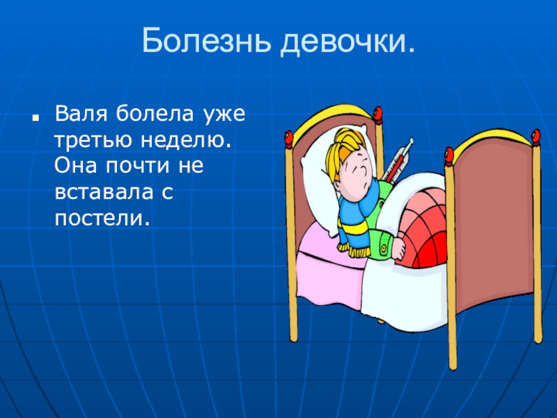 Болезнь девочки.Валя болела уже третью неделю. Она почти не вставала с постели.