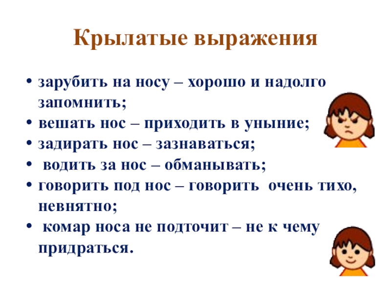 Крылатые выражениязарубить на носу – хорошо и надолго запомнить; вешать нос – приходить в уныние; задирать нос