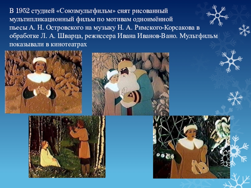 Слайд 10В 1952 студией «Союзмультфильм» снят рисованный мультипликационный фильм по мотивам одноимённой пьесы А. Н. Островского на
