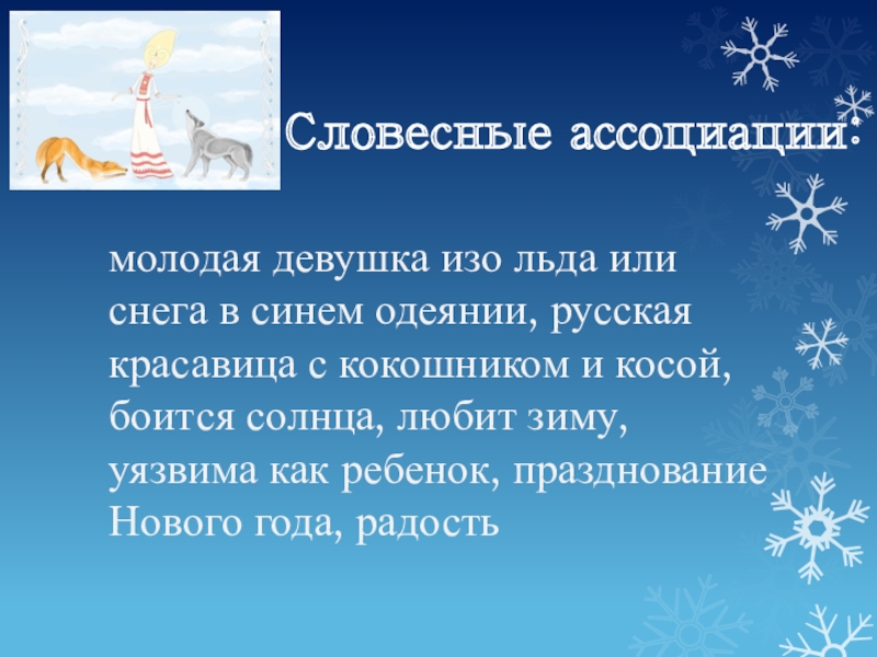красавица с кокошником и косой, боится солнца, любит зиму, уязвима как ребенок, празднование Нового года, радость