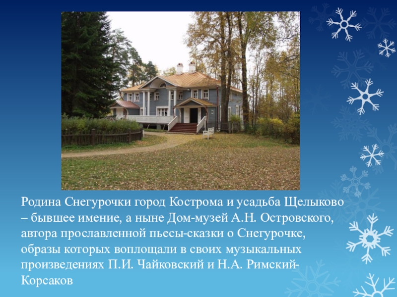 Слайд 9Родина Снегурочки город Кострома и усадьба Щелыково – бывшее имение, а