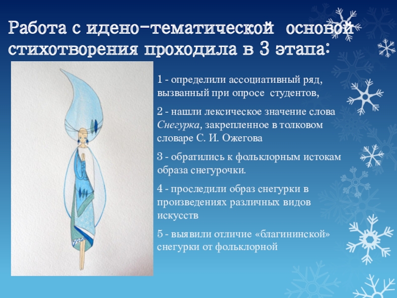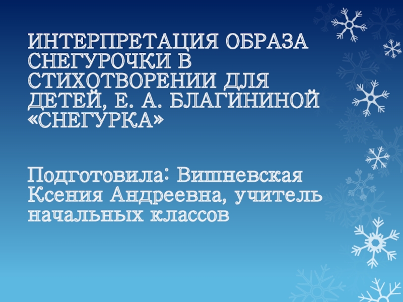 Слайд 1ИНТЕРПРЕТАЦИЯ ОБРАЗА СНЕГУРОЧКИ В СТИХОТВОРЕНИИ ДЛЯ ДЕТЕЙ, Е. А. БЛАГИНИНОЙ «СНЕГУРКА»