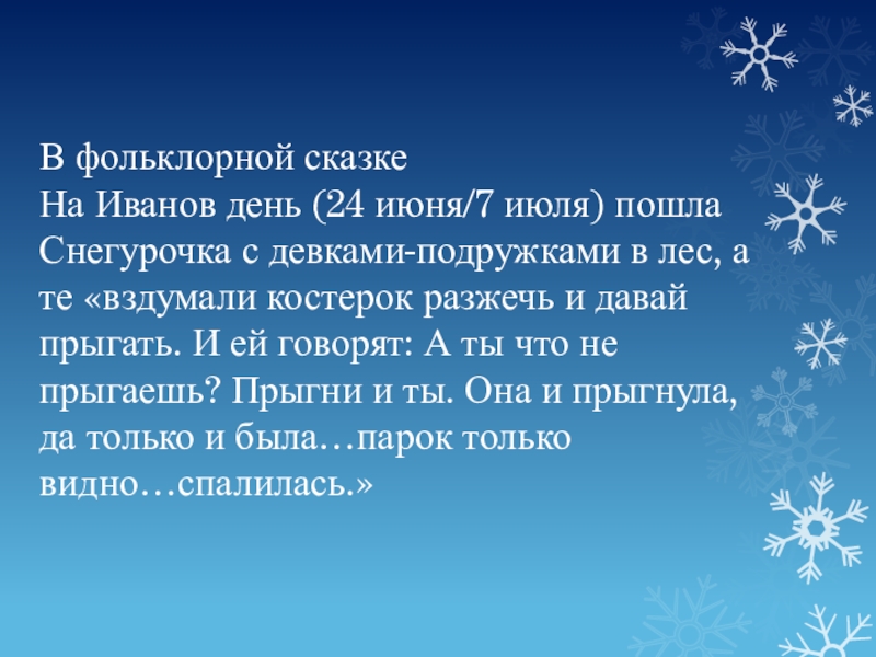 На Иванов день (24 июня/7 июля) пошла Снегурочка с
