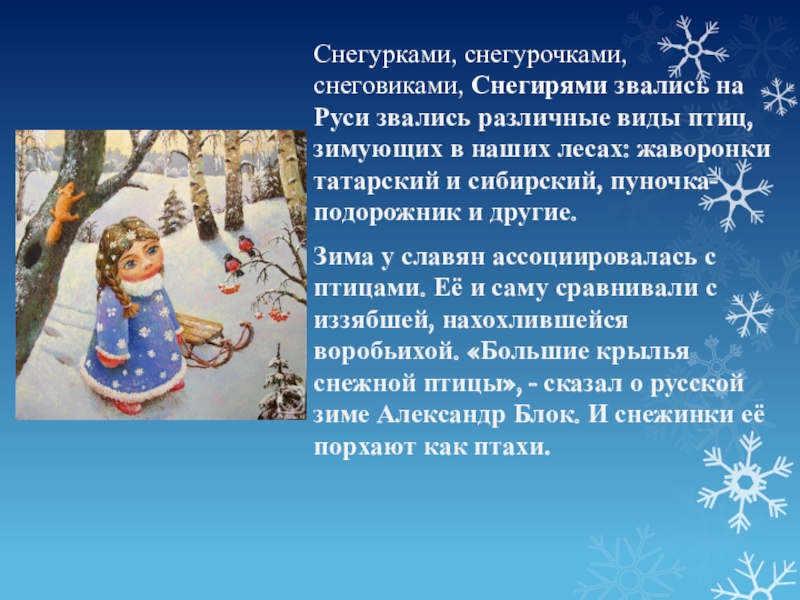 Слайд 7Снегурками, снегурочками, снеговиками, Снегирями звались на Руси звались различные виды птиц,