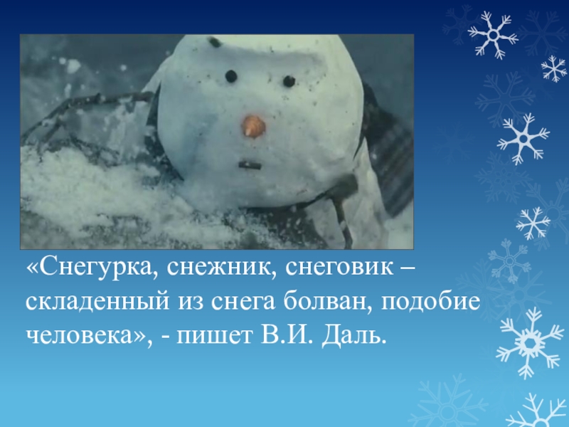 Слайд 8«Снегурка, снежник, снеговик – складенный из снега болван, подобие человека», -