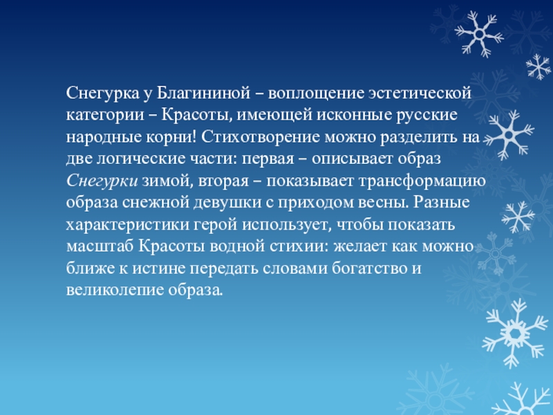 русские народные корни! Стихотворение можно разделить на две логические части: первая – описывает образ Снегурки зимой, вторая – показывает трансформацию образа снежной девушки с приходом весны. Разные характеристики герой использует, чтобы показать масштаб Красоты водной стихии: желает как можно ближе к истине передать словами богатство и великолепие образа.