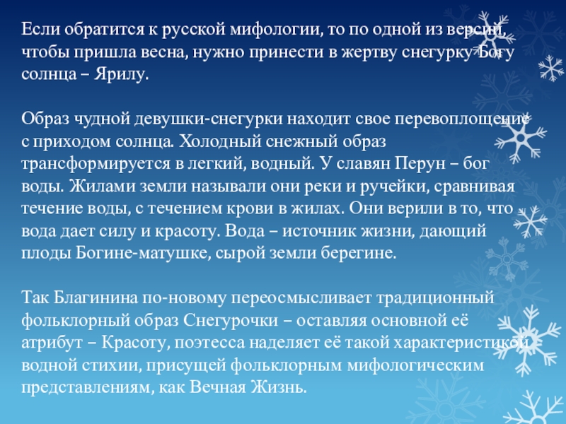 Так Благинина по-новому переосмысливает традиционный фольклорный образ Снегурочки – оставляя основной её атрибут – Красоту, поэтесса наделяет её такой характеристикой водной стихии, присущей фольклорным мифологическим представлениям, как Вечная Жизнь.
