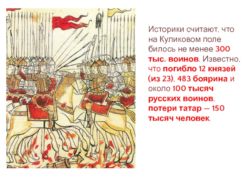 Слайд 11Историки считают, что на Куликовом поле билось не менее 300 тыс.