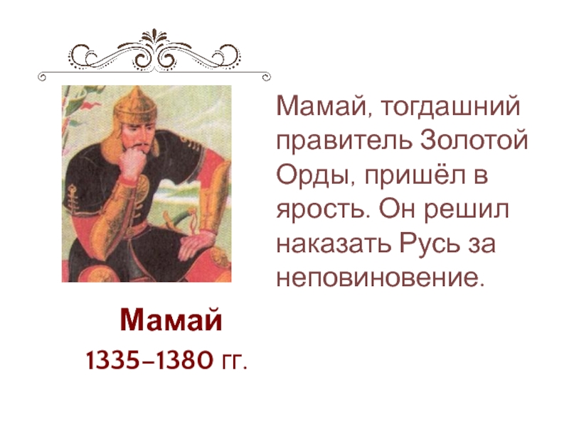 Мамай1335–1380 гг.Мамай, тогдашний правитель Золотой Орды, пришёл в ярость. Он решил наказать Русь за неповиновение.