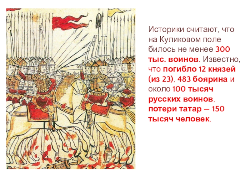 Слайд 11Историки считают, что на Куликовом поле билось не менее 300 тыс.