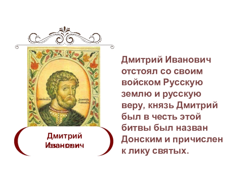 Слайд 10Дмитрий Иванович отстоял со своим войском Русскую землю и русскую веру,