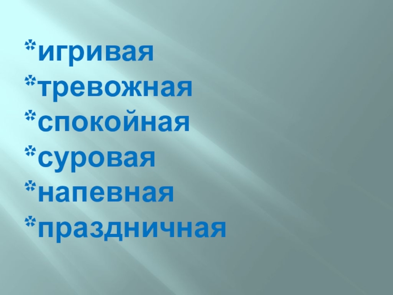 Слайд 11*игривая *тревожная *спокойная *суровая *напевная *праздничная