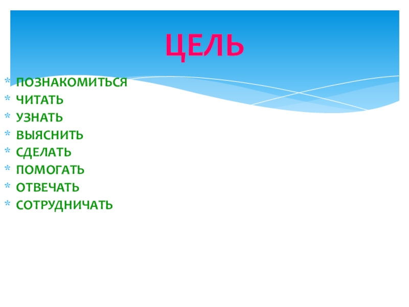 ЦЕЛЬ ПОЗНАКОМИТЬСЯЧИТАТЬУЗНАТЬВЫЯСНИТЬСДЕЛАТЬПОМОГАТЬОТВЕЧАТЬСОТРУДНИЧАТЬ